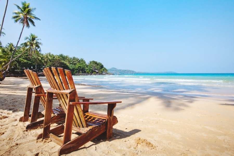 Deux chaises en bois face à la mer turquoise sur une plage de sable fin bordée de palmiers, dans une île de vacances tropicale.